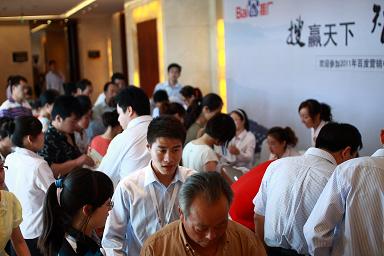 在四月底,我們公司召開了“百度營銷中國行動員大會”,給每位員工做好思想動員,希望每位員工在思想上重視這次會議,通過大家的努力保證會議的順利召開,最終完美呈現給廣大客戶。會前一個月我們在鹽城分眾傳媒投放了關于營銷中國行的宣傳報道片,在一個月的時間內滾動循環播出,同時在鹽城晚報半版的形式進行中國行活動的宣傳,通過鋪天蓋地的宣傳報道給客戶帶來視覺與聽覺的沖擊,把百度中國行的信息席卷鹽城大地,傳達給鹽城地區所有企業客戶。在公司五月初把活動日程安排公布以后,市場部開始著手準備活動地點、活動的具體流程、活動各項物料準備等,而商務部則是在活動前半個多月就開始客戶的邀約。重點在邀約客戶這方面,為了保證會議現場客戶的數量與質量度,我們要求每位商務人員對于每位客戶首先通過多次電話形式進行溝通,然后以傳真回執和送達邀請函的方式確認到場情況。